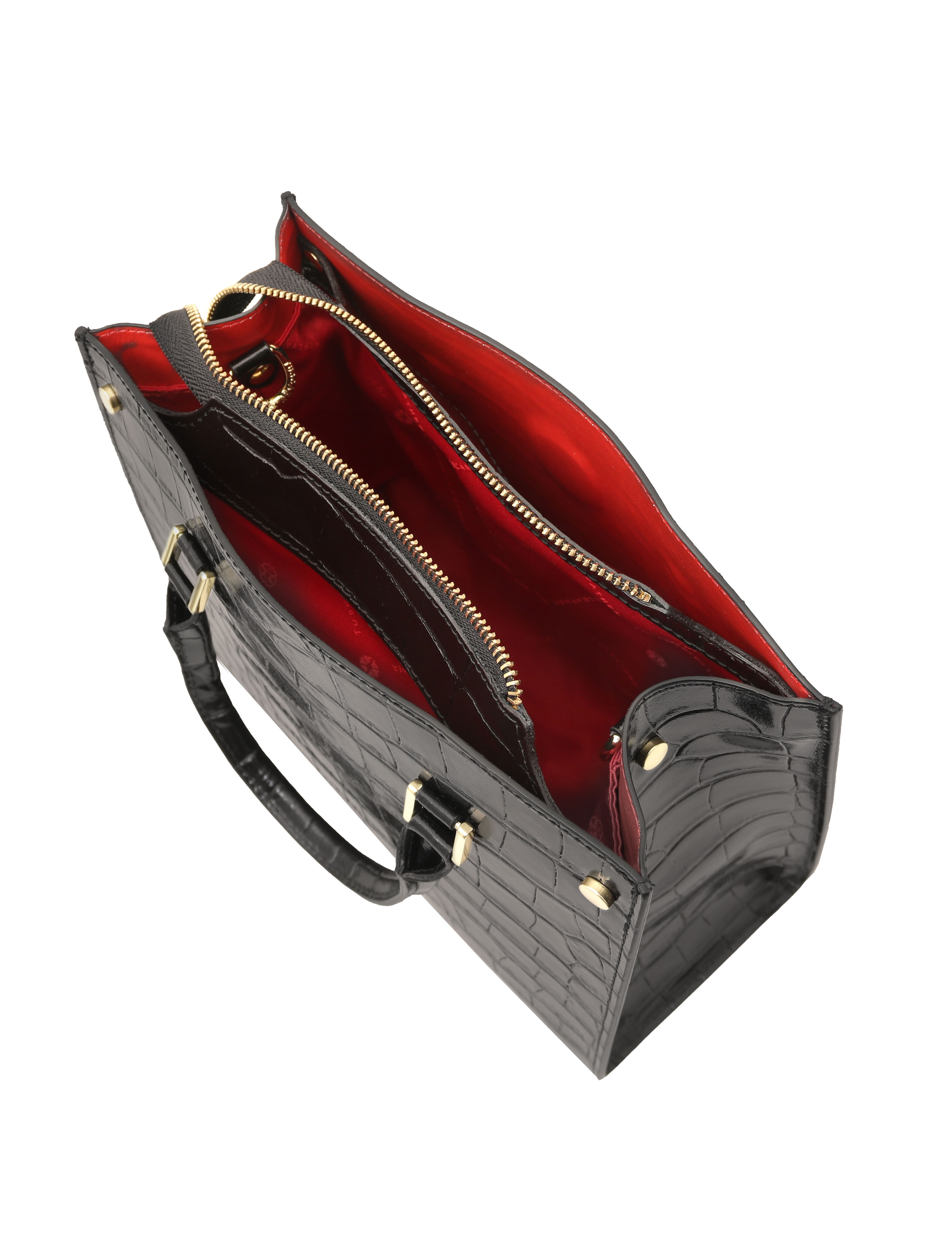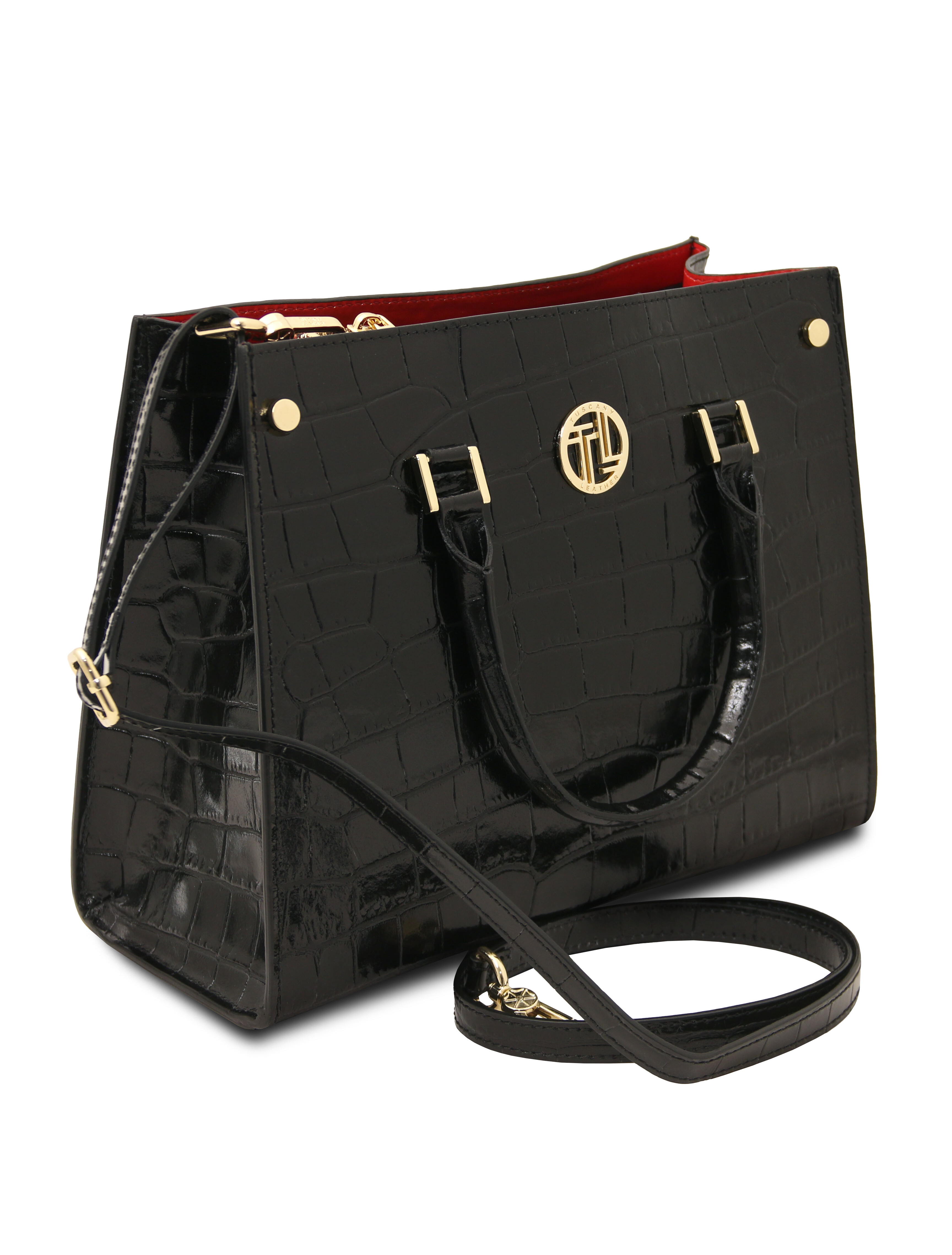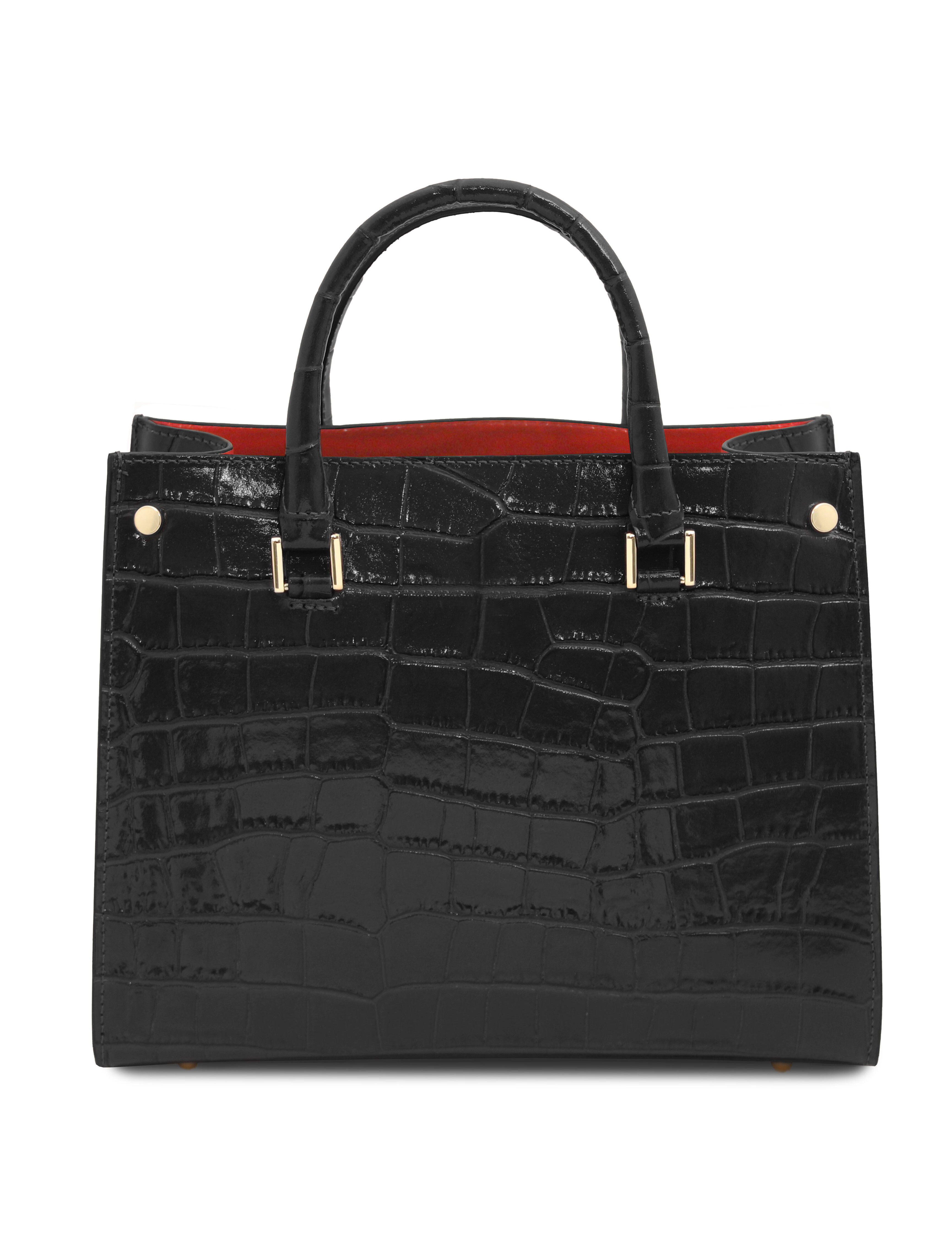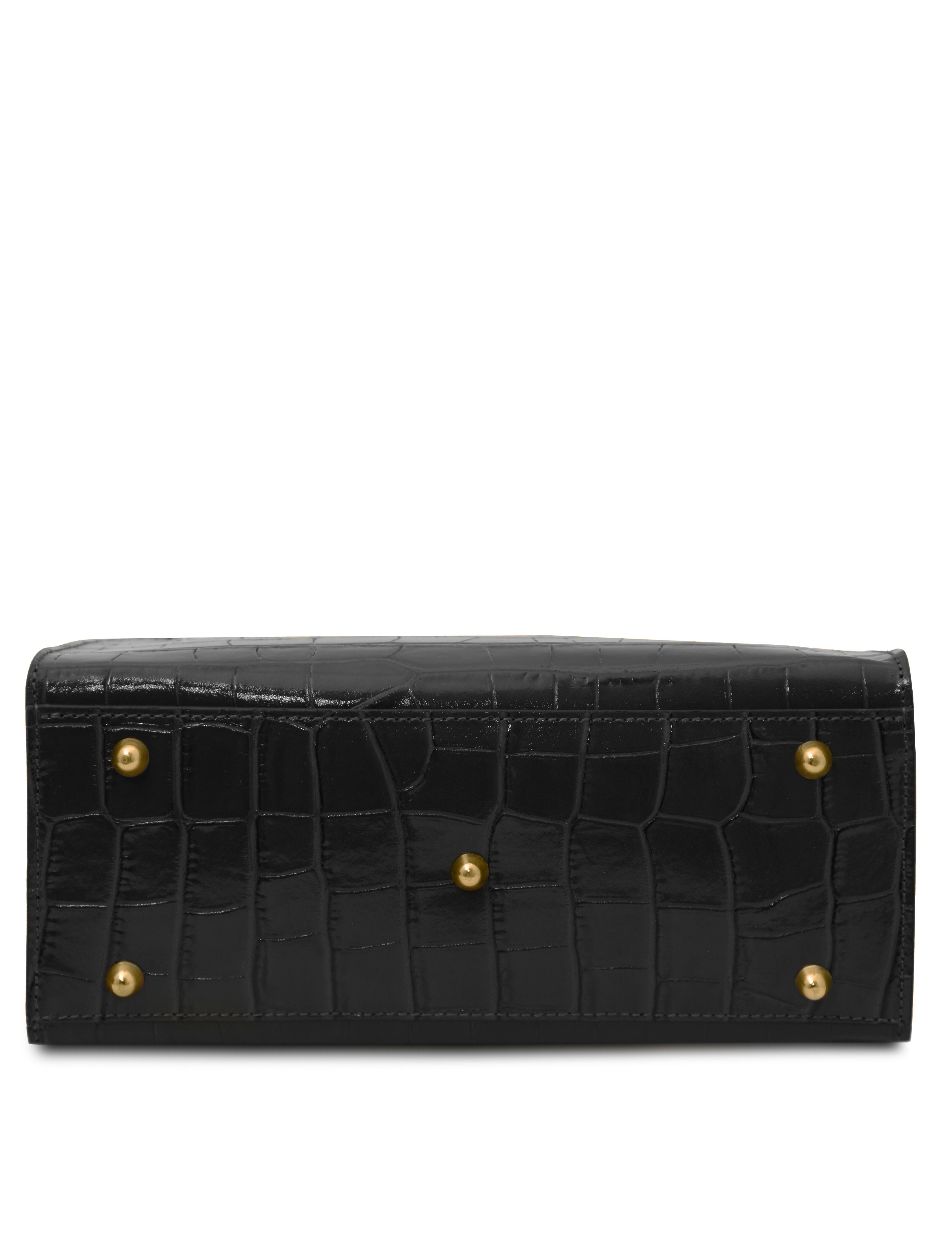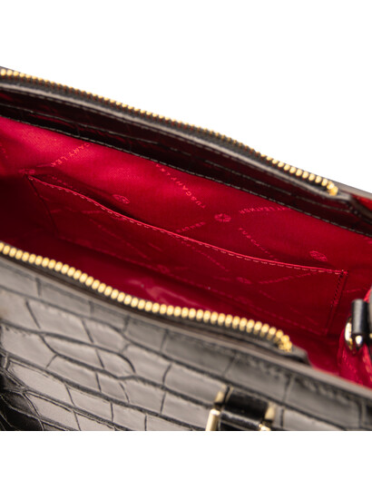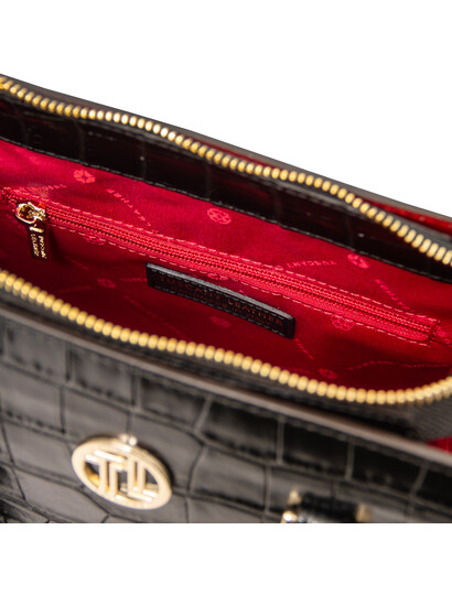 Descoperă geanta din piele cu imprimeu Croque Croc, în nuanța clasică de negru, un accesoriu sofisticat pentru orice ținută. Realizată din piele de înaltă calitate, geanta impresionează prin textura sa elegantă, inspirată de pielea de crocodil, care adaugă un plus de rafinament și stil. Interiorul spațios îți permite să îți organizezi cu ușurință telefonul, portofelul și obiectele esențiale de zi cu zi. Sistemul de închidere sigur și detaliile metalice fine completează designul modern. Poate fi purtată atât la birou, cât și la ieșirile de seară, devenind rapid piesa ta preferată. Alege geanta Croque Croc pentru un look contemporan, feminin și irezistibil de chic.